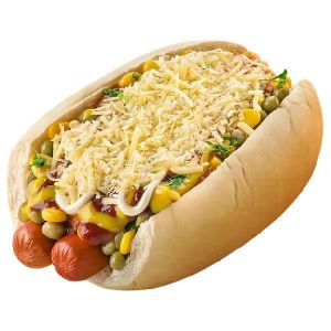 PÃO, SALSICHA, MAIONESE, CATCHUP, MOSTARDA, BACON, MILHO, ERVILHA, TOMATE, CEBOLA, BATATA PALHA.