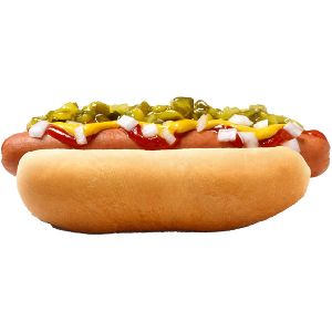 PÃO, SALSICHA, MAIONESE, CATCHUP, MOSTARDA, MILHO, ERVILHA, TOMATE, CEBOLA, BATATA PALHA.