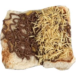 PÃO, BANANA, CHOCOLATE, AÇUCAR COM CANELA E BATATA PALHA.